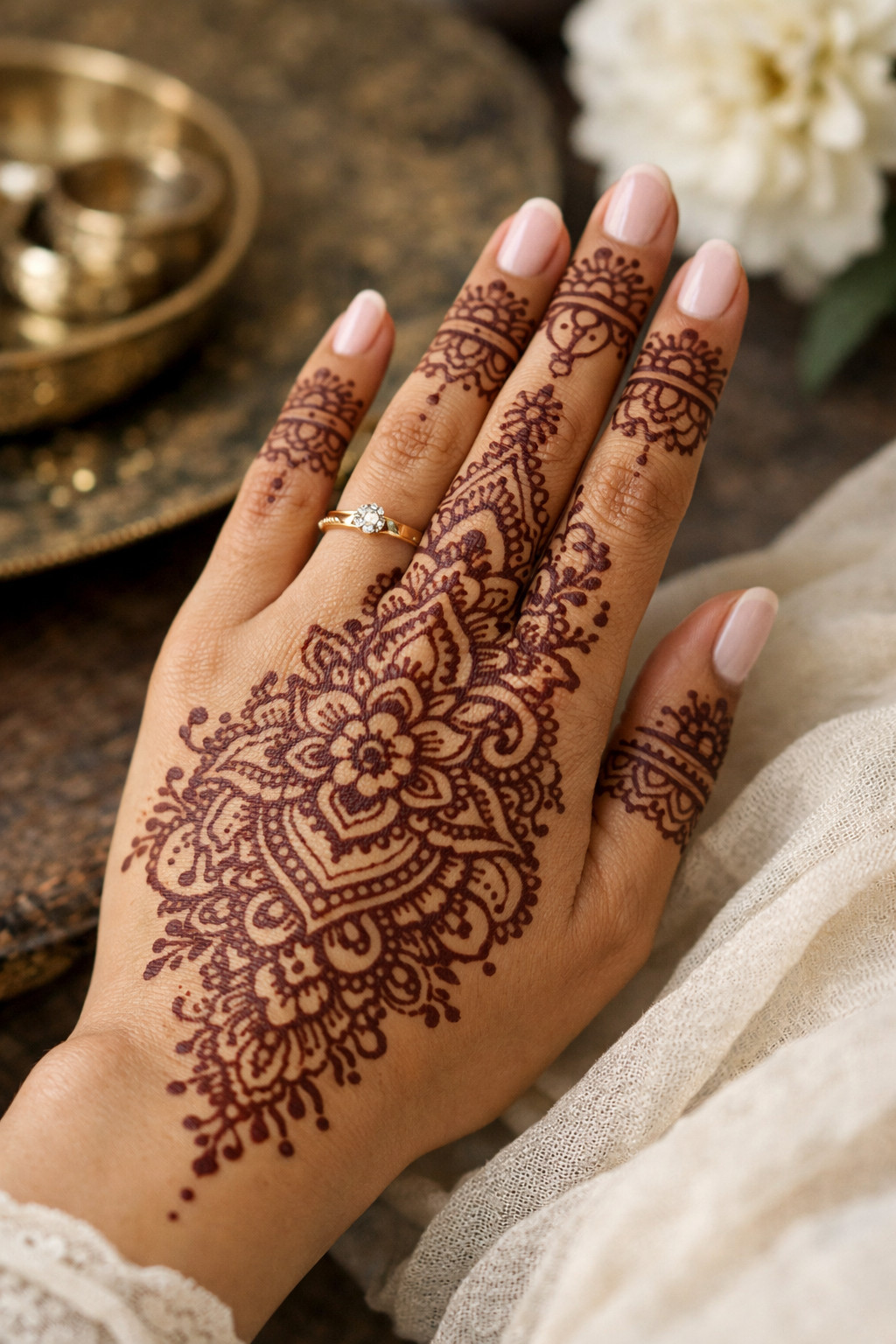 Mehndi is a traditional ritual in weddings. In many South Asian cultures and religions, a pre-wedding ceremony known as the “Mehndi night” is held, during which the bride’s hands and feet are adorned with intricate designs. The patterns often include symbols of love, prosperity, and protection. In some customs, the groom’s name is hidden within the design, and he must find it after the wedding ceremony.